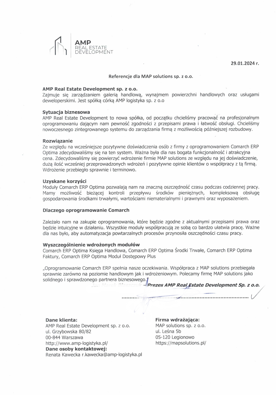 „Oprogramowanie Comarch ERP spełnia nasze oczekiwania. Współpraca z MAP solutions przebiegała sprawnie zarówno na poziomie handlowym jak i wdrożeniowym. Polecamy firmę MAP solutions jako solidnego i sprawdzonego partnera biznesowego.”