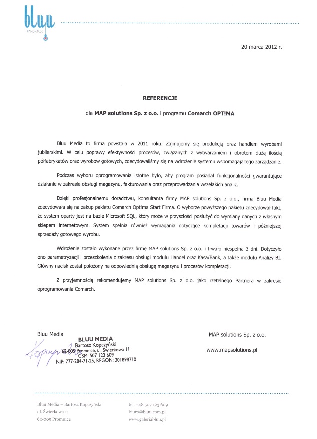 […] Z przyjemnością rekomendujemy MAP solutions Sp. z o.o. jako rzetelnego Partnera w zakresie oprogramowania Comarch.