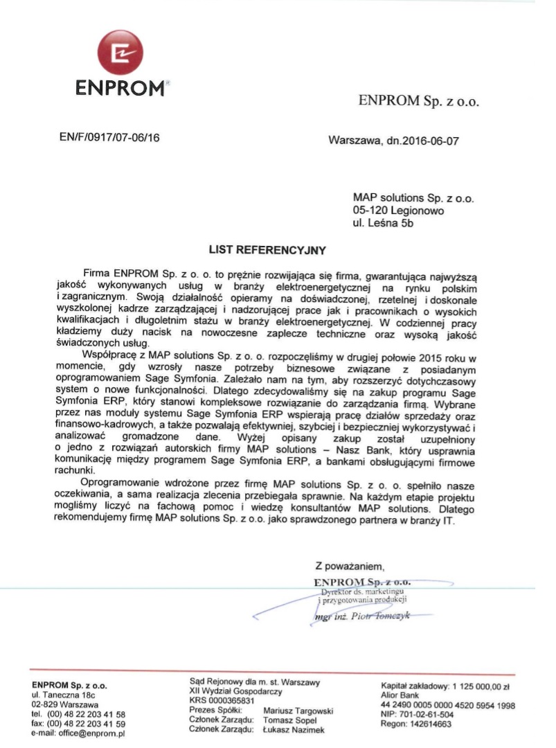[…] Współpracę z MAP solutions Sp. z o. o. rozpoczęliśmy w drugiej połowie 2015 roku w momencie, gdy wzrosły nasze potrzeby biznesowe związane z posiadanym oprogramowaniem Sage Symfonia. Zależało nam na tym, aby rozszerzyć dotychczasowy system o nowe funkcjonalności. Dlatego zdecydowaliśmy się na zakup programu Sage Symfonia ERP, który stanowi kompleksowe rozwiązanie do zarządzania firmą. […]
