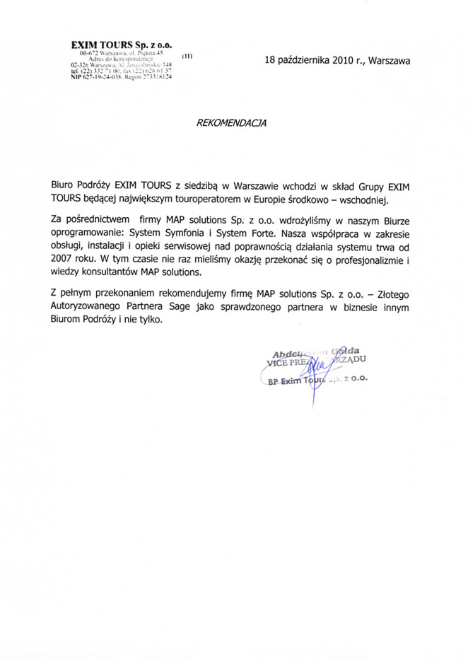 […] Z pełnym przekonaniem rekomendujemy firmę MAP solutions Sp. z o.o. […] jako sprawdzonego partnera w biznesie innym Biurom Podróży i nie tylko.