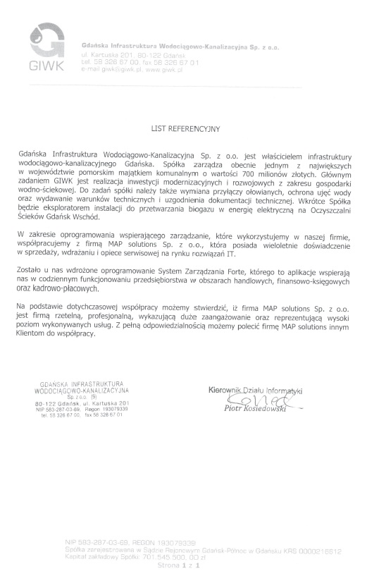 […] Na podstawie dotychczasowej współpracy możemy stwierdzić, iż MAP solutions Sp. z o.o. jest firmą rzetelną, profesjonalną, wykazującą duże zaangażowanie oraz reprezentującą wysoki poziom wykonywanych usług. […]