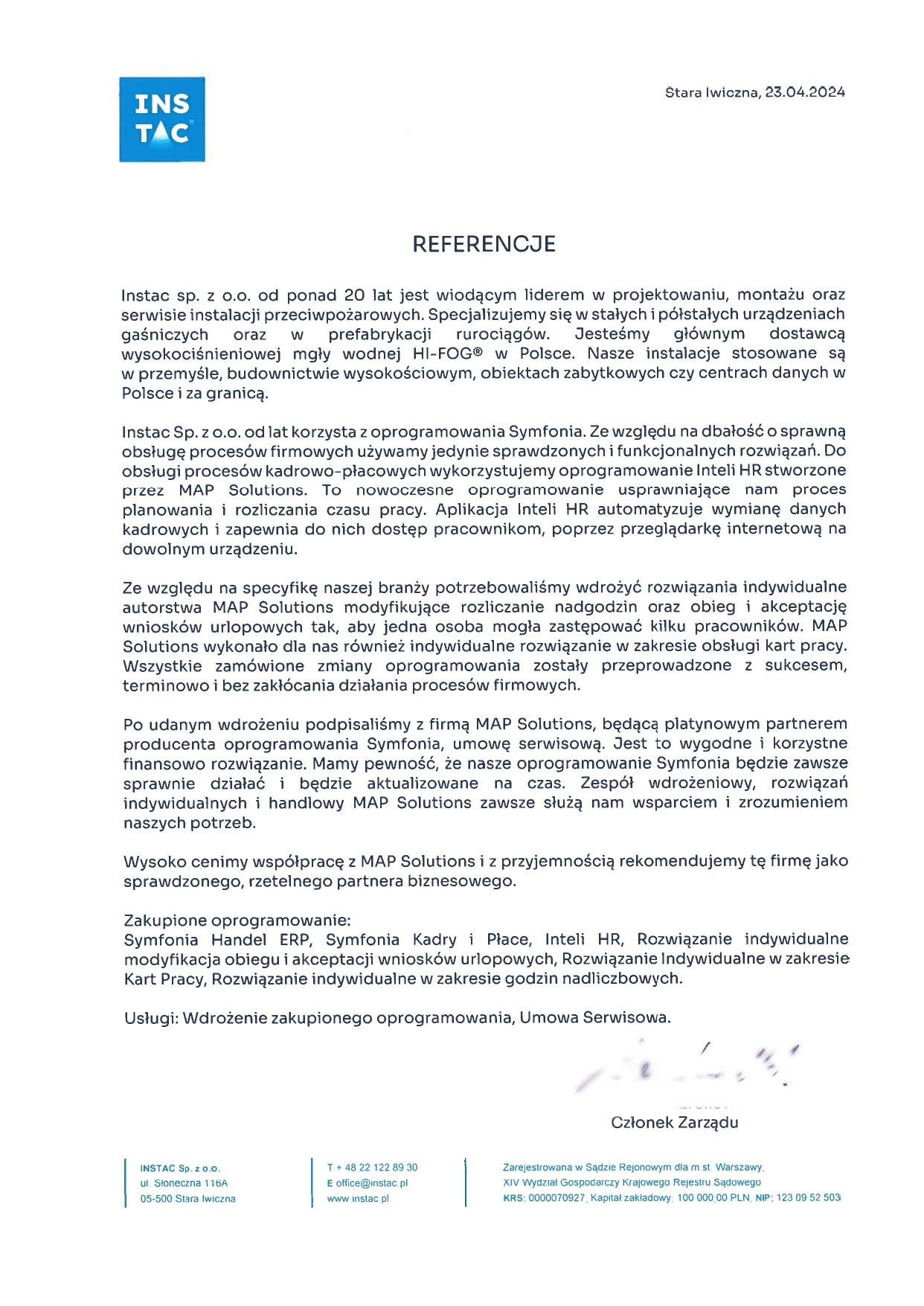 „Do obsługi procesów kadrowo-płacowych wykorzystujemy oprogramowanie Inteli HR stworzone przez MAP solutions. Ze względu na specyfikę naszej branży potrzebowaliśmy wdrożyć rozwiązania indywidualne autorstwa MAP solutions modyfikujące rozliczanie nadgodzin oraz obieg i akceptację wniosków urlopowych…Wysoko cenimy współpracę z MAP solutions i z przyjemnością rekomendujemy tę firmę jako sprawdzonego, rzetelnego partnera biznesowego.”