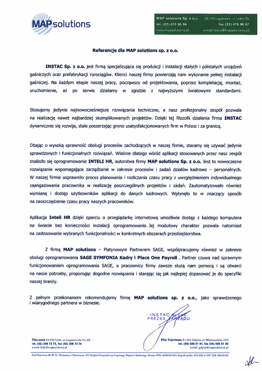 „[…] Dbając o wysoką sprawność obsługi procesów zachodzących w naszej firmie, staramy się używać jedynie sprawdzonych i funkcjonalnych rozwiązań. Właśnie dlatego wśród aplikacji stosowanych przez nasz zespół znalazło się oprogramowanie INTELI HR, autorstwa firmy MAP solutions Sp. z o.o”.