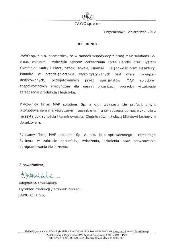 […] Pracownicy firmy MAP solutions Sp. z o.o. wykazują się profesjonalnym przygotowaniem merytorycznym i technicznym, a świadczoną pomoc wykonują z należytą dokładnością i terminowością. […]