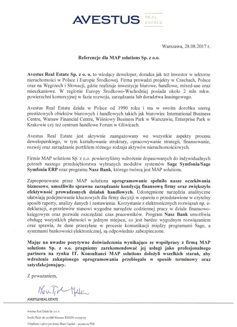 […] Firmie MAP solutions Sp. z o.o. powierzyliśmy wdrożenie dopasowanych do indywidualnych potrzeb naszego przedsiębiorstwa wybranych modułów systemów Sage Symfonia/Sage Symfonia ERP oraz programu Nasz Bank, którego twórcą jest MAP solutions. Zaproponowane przez MAP solutions oprogramowanie spełniło nasze oczekiwania biznesowe, umożliwiło sprawne zarządzanie kondycją finansową firmy oraz zwiększyło efektywność prowadzonych działań handlowych […].