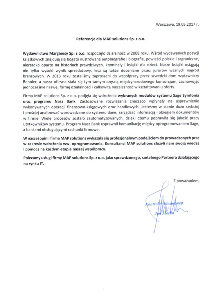 […] W naszej opinii firma MAP solutions wykazała się profesjonalnym podejściem do prowadzonych prac w zakresie wdrożenia ww. oprogramowania. Konsultanci MAP solutions służyli nam swoją wiedzą i pomocą na każdym etapie naszej współpracy. Polecamy usługi firmy MAP solutions Sp. z o.o. jako sprawdzonego, rzetelnego Partnera działającego na rynku IT.