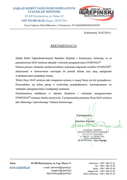 […] Podczas wdrażania zaobserwowaliśmy doskonałą znajomość modułów Symfonii, elastyczność w dostosowaniu rozwiązań do potrzeb klienta oraz dużą umiejętność w przekazywaniu posiadanej wiedzy.